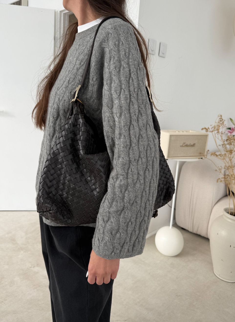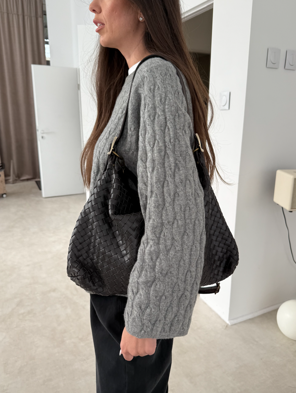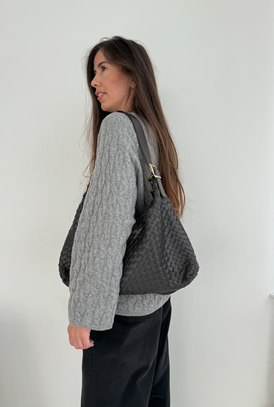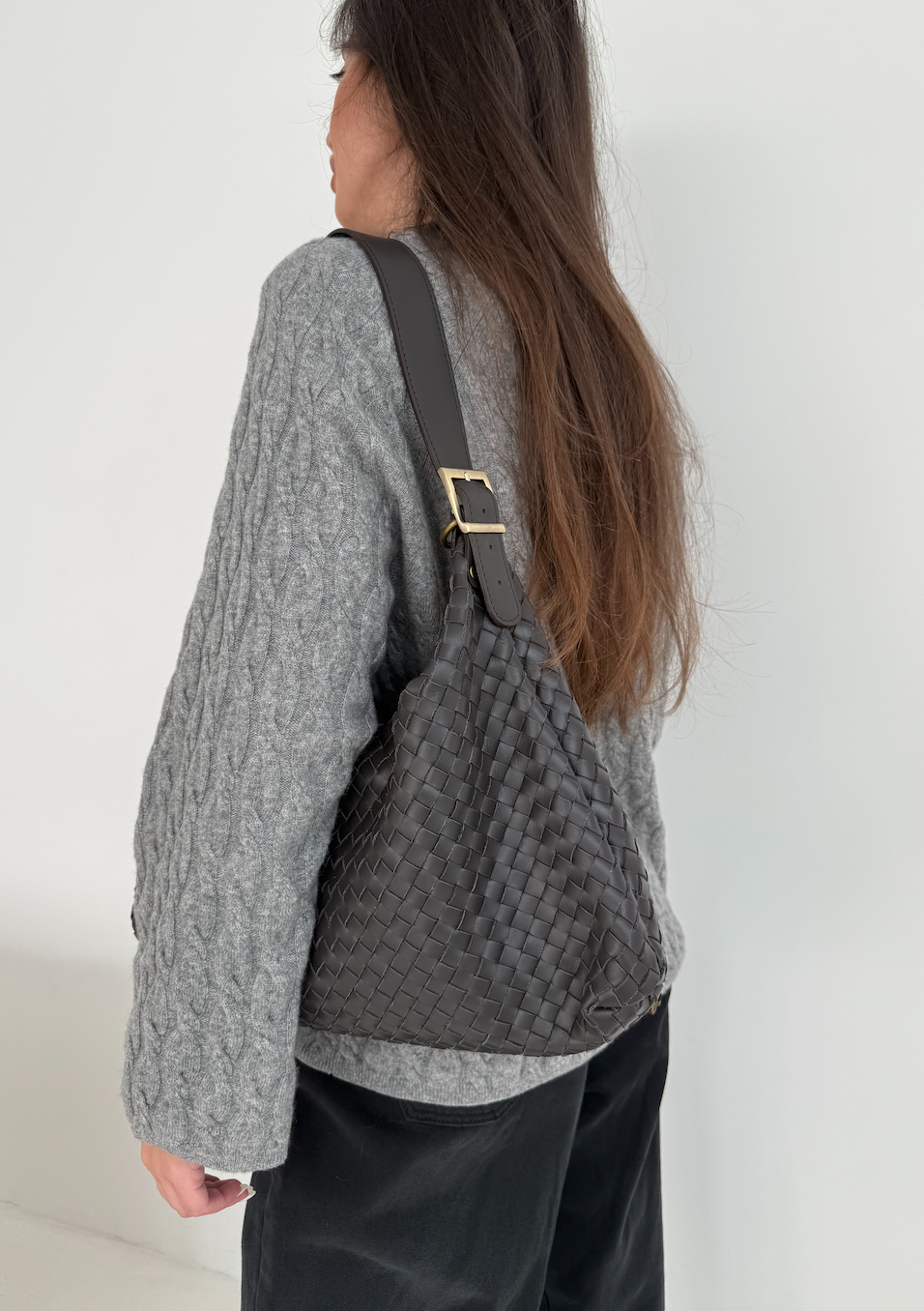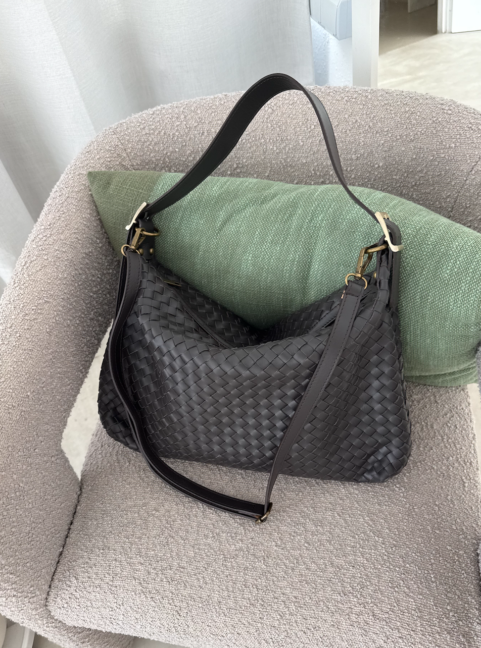 Stylowa, pojemna torebka ręcznie pleciona z naturalnej, miękkiej skóry. Głęboki ciemny brąz i złote okucia nadają jej ponadczasowej elegancji. W zestawie dodatkowa skórzana rączka, dzięki której wygodnie dopasujesz sposób noszenia do sytuacji – do ręki lub na ramię. Idealna na co dzień i do pracy.