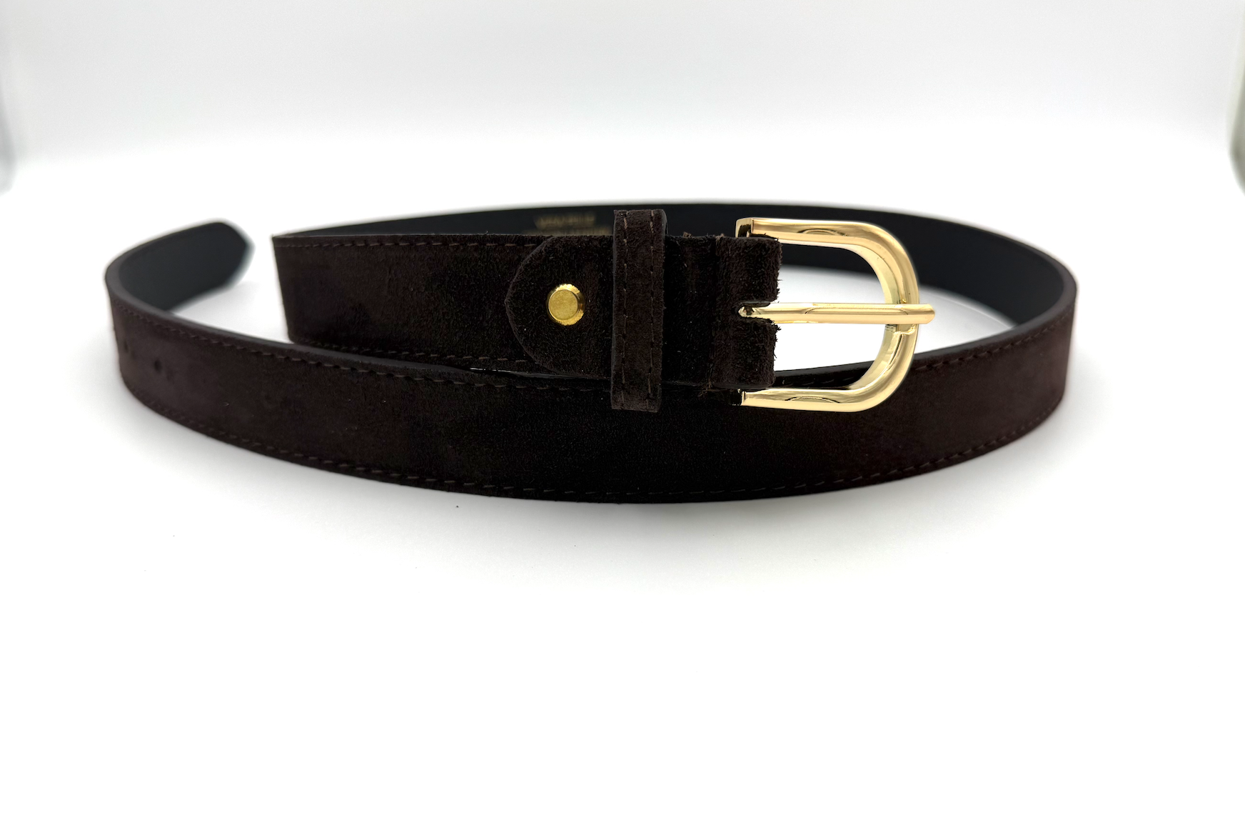 Stylowy pasek damski Vera Pelle wykonany z miękkiego, naturalnego włoskiego zamszu w brązowym kolorze. Jego klasyczny design w połączeniu ze złotą klamrą nadaje całości eleganckiego charakteru. Dzięki szerokości 3 cm doskonale sprawdzi się zarówno do spodni, jak i do sukienek czy casualowych jeansów. Pasek jest wygodny, trwały i stanowi wyjątkowy dodatek do każdej garderoby.